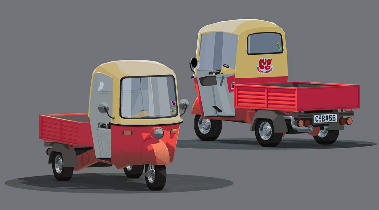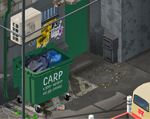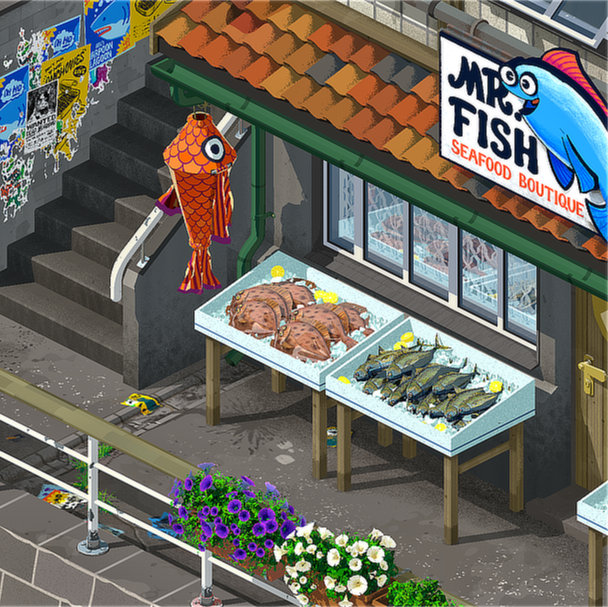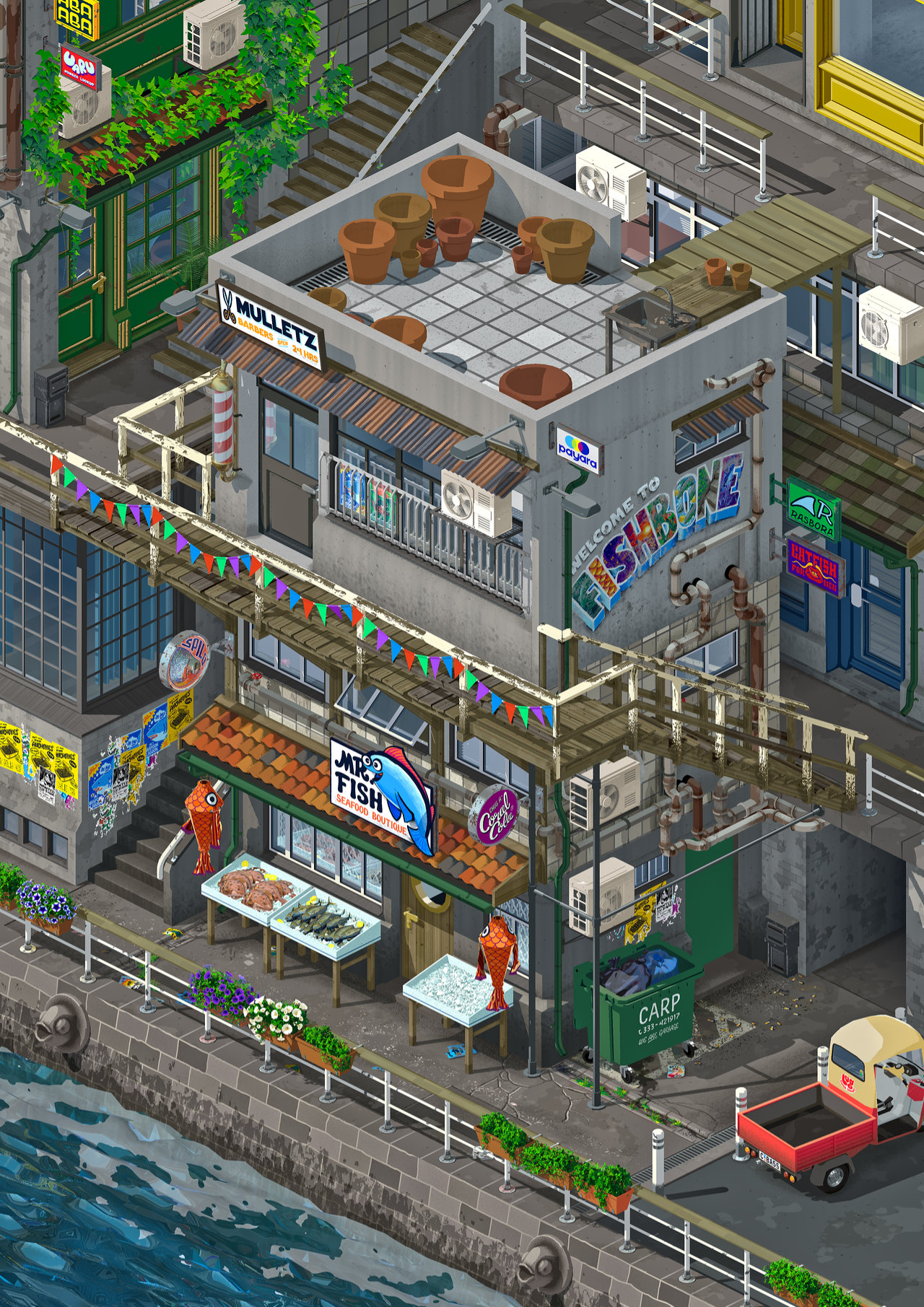 Velkommen til Fishbone. Det er litt folketomt foreløpig.Veggmaleri inspirert av sånne... Sånne her. Alle de fiktive merkevarene er oppkalt etter engelske navn på fiskearter.Mr. Fish, en fiskebutikk.Her er det noen som pleier å ta seg litt frisk luft.Karikert tuk tuk.Plakater, bakgrunnsrekvisitter.3D-illustrasjon