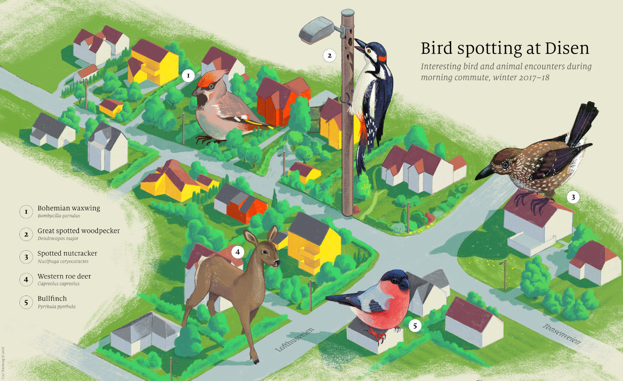 Et kart over en rotete leilighet, for eksempel, kunne sikkert fortalt masse om meg selv, men jeg valgte å fokusere på én interesse og tegne et kart over fugle- og dyreobservasjoner i nærområdet.